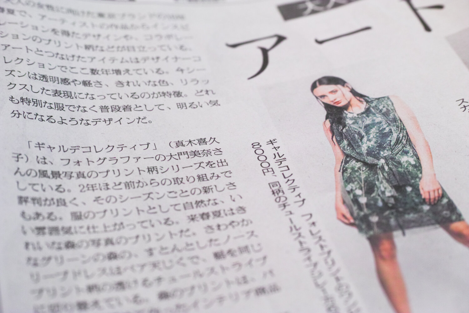 『「ギャルデコレクティブ」(真木喜久子)は、フォトグラファーの大門美奈さんの風景写真のプリント柄シリーズを出している。2年ほど前からの取り組みで評判が良く、そのシーズンごとの新しさもある。服のプリントとして自然な、いい雰囲気に仕上がっている。来春夏はきれいな森の写真のプリントだ。さわやかなグリーンの森の、すとんとしたノースリーブドレスはベア天じくで、裾を同じプリント柄のチュールストライプに切り替えている。森のプリントは、バッグや今回初めて作ったインテリア商品にも使っている。』
